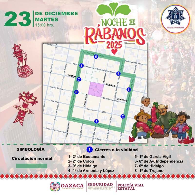 80 elementos y unidades especiales resguardarán el zócalo de Oaxaca para un tránsito seguro durante la festividad La Policía Vial Estatal implementará un dispositivo de seguridad con motivo de la 128 edición de la Noche de Rábanos 2025, que se llevará a cabo este martes en