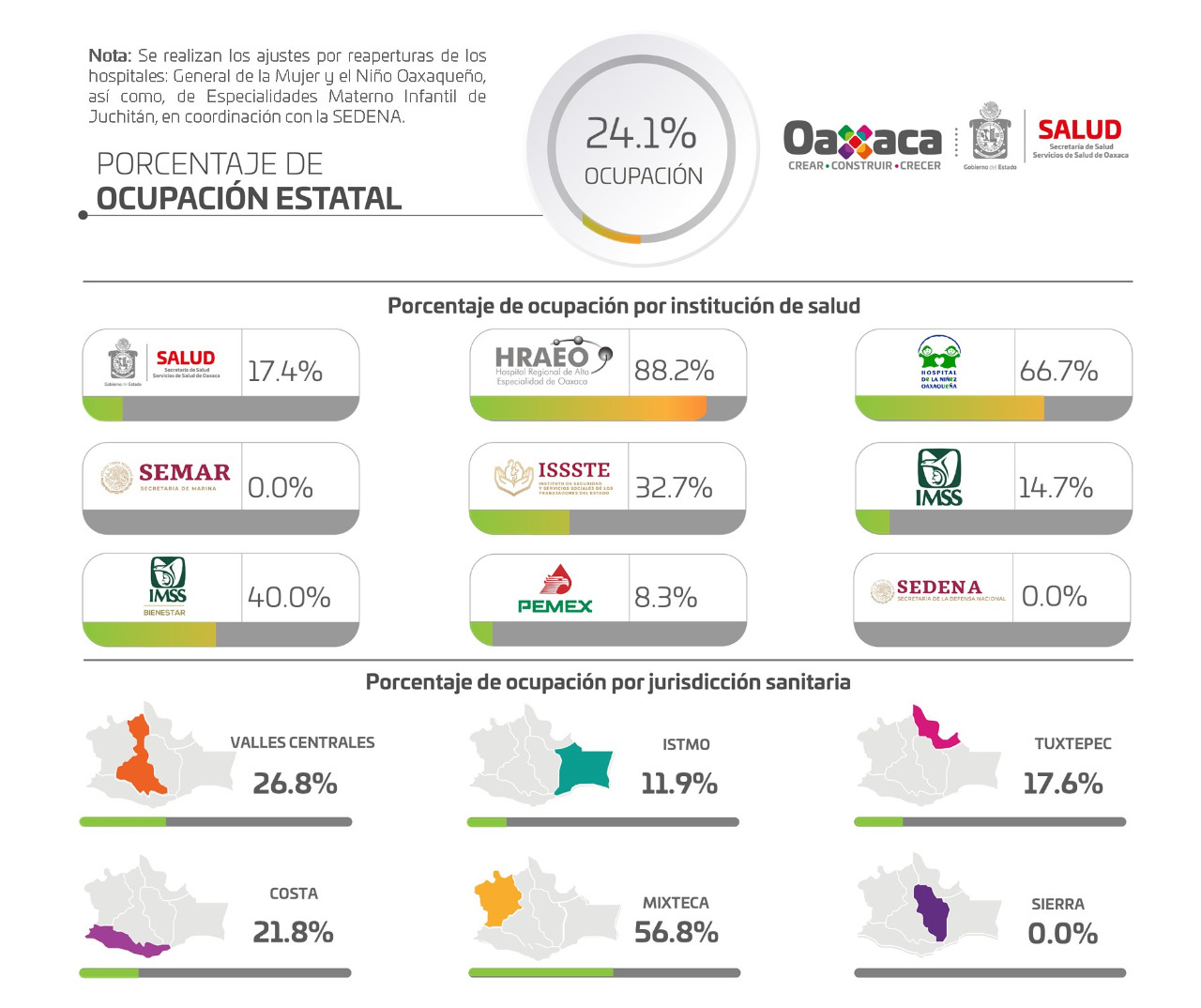 En relación a las camas ocupadas por pacientes COVID-19, por Jurisdicciones Sanitarias la Mixteca registra el 56.8%, seguido de Valles Centrales 26.8%, Costa 21.8%, Tuxtepec 17.6%, el Istmo 11.9%, y Sierra 0%.