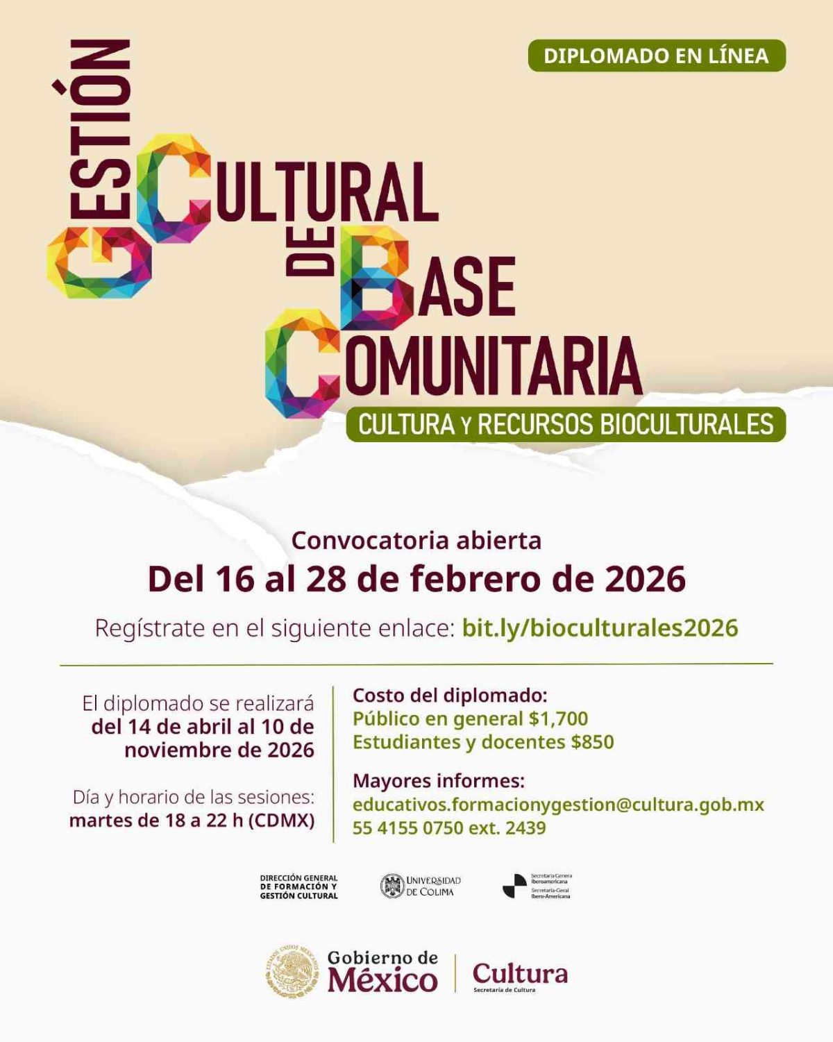 La Secretaría de Cultura del Gobierno de México anunció la segunda edición del diplomado “Gestión cultural de base comunitaria. Cultura y recursos bioculturales”, un programa formativo que se impartirá en modalidad virtual y cuyo prerregistro permanecerá abierto hasta el 28 de febrero. Los resultados se darán a conocer el 16 de marzo de 2026.