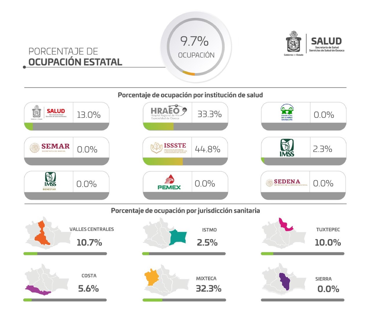 Con relación a las camas de hospitalización para la atención de la pandemia, la entidad registra 90.3% de disponibilidad, con un total de 33 pacientes hospitalizados, tres son de nuevo ingreso y cuatro hospitales al 100% de su capacidad.