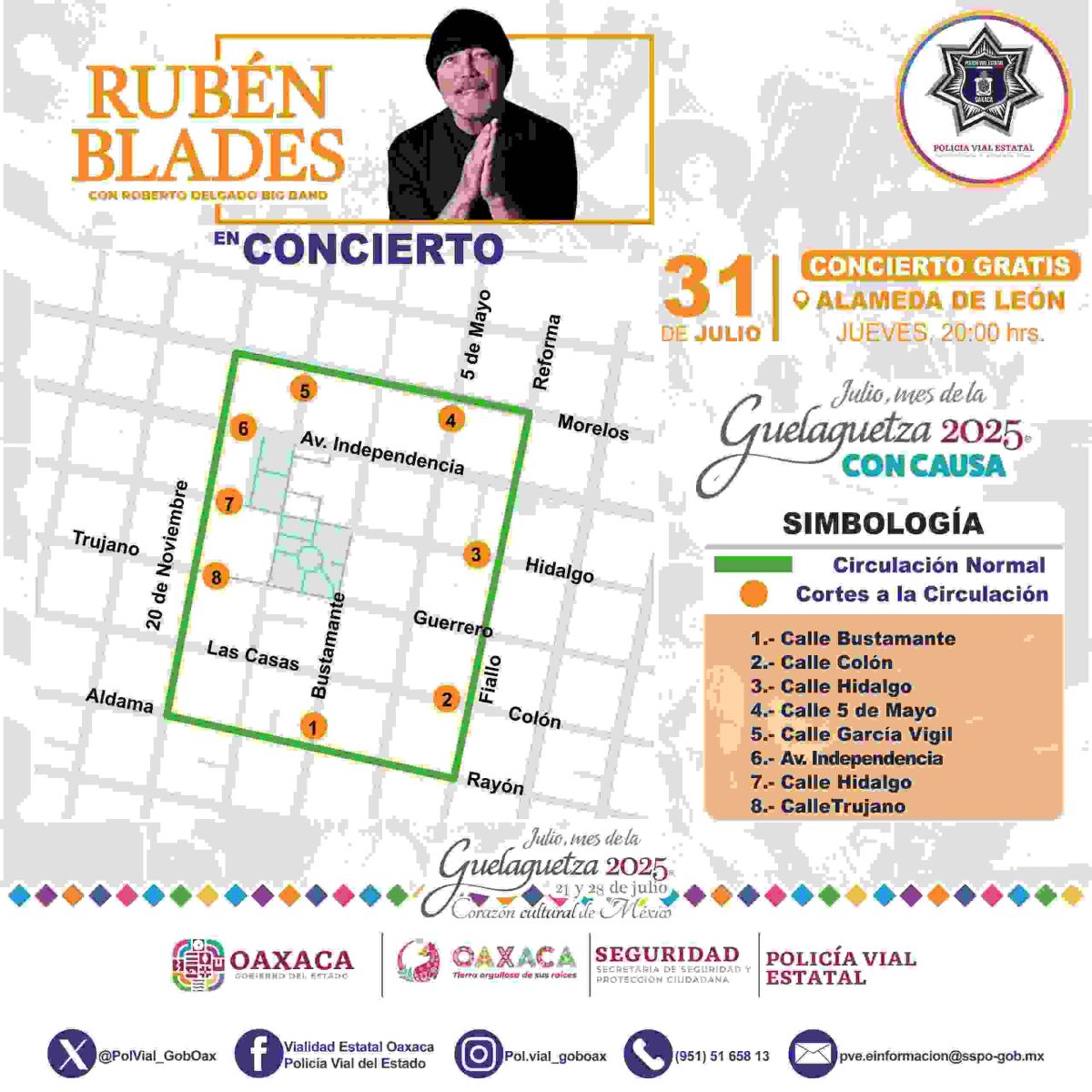 La Policía Vial Estatal aplicará un operativo especial este jueves 31 de julio en el Centro Histórico de Oaxaca. Enlace de la Costa Con motivo del esperado concierto gratuito del cantautor panameño Rubén Blades, acompañado por la Roberto Delgado Big Band, la Policía Vial Estatal reforzará las
