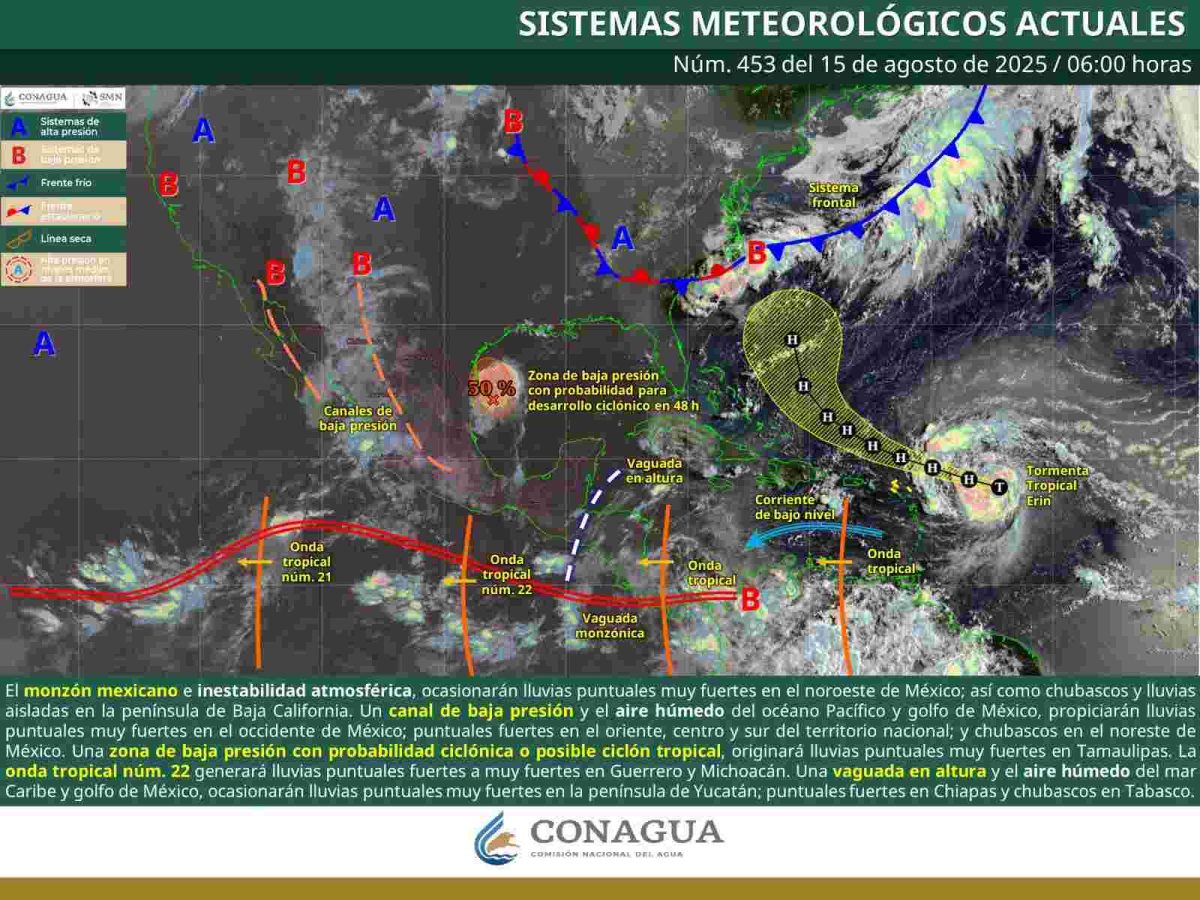 Persisten condiciones inestables por humedad de ambos océanos y la onda tropical número 22, advierte Protección Civil.