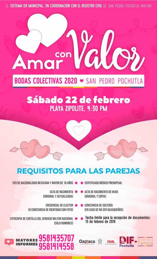 Participa en las Bodas Colectivas 2020 en San Pedro Pochutla, la cual se llevará a cabo el Sábado 22 de febrero Playa Zipolite, Oaxaca. Recuerda consultar las bases.