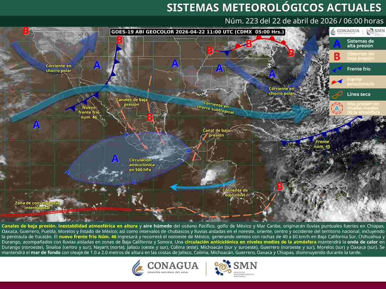 El reporte indica que la presencia de canales de baja presión y el ingreso de humedad desde el océano Pacífico y el Golfo de México provocará intervalos de chubascos en diversas zonas del estado, principalmente durante la tarde. Estas precipitaciones se estiman entre 5 y 25 milímetros, con posibilidad de descargas eléctricas.