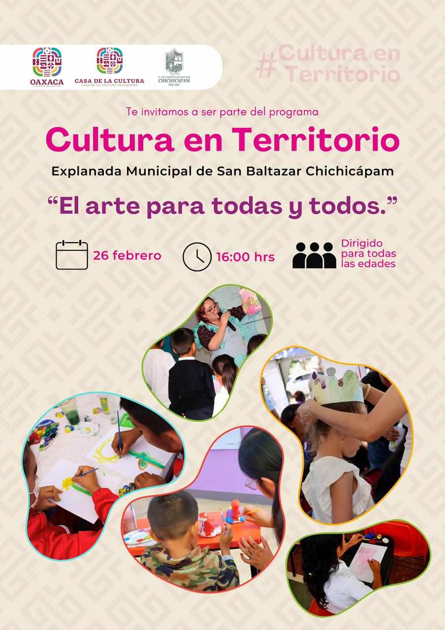 La Casa de la Cultura Oaxaqueña (CCO) anunció la realización del programa Cultura en Territorio en el municipio de San Baltazar Chichicápam, que se llevará a cabo del 19 al 26 de febrero, con el objetivo de fortalecer el derecho cultural y promover espacios de convivencia que contribuyan a prevenir situaciones de violencia.