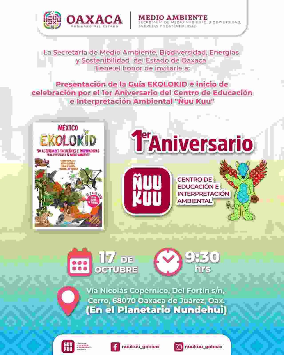 Oaxaca de Juárez, Oax., 14 de octubre de 2025.– El Centro de Educación e Interpretación Ambiental Ñuu Kuu conmemorará su primer aniversario este 17 de octubre con la presentación de una guía ecológica, una obra de teatro y diversos talleres lúdicos, como parte de sus actividades educativas y de sensibilización ambiental.