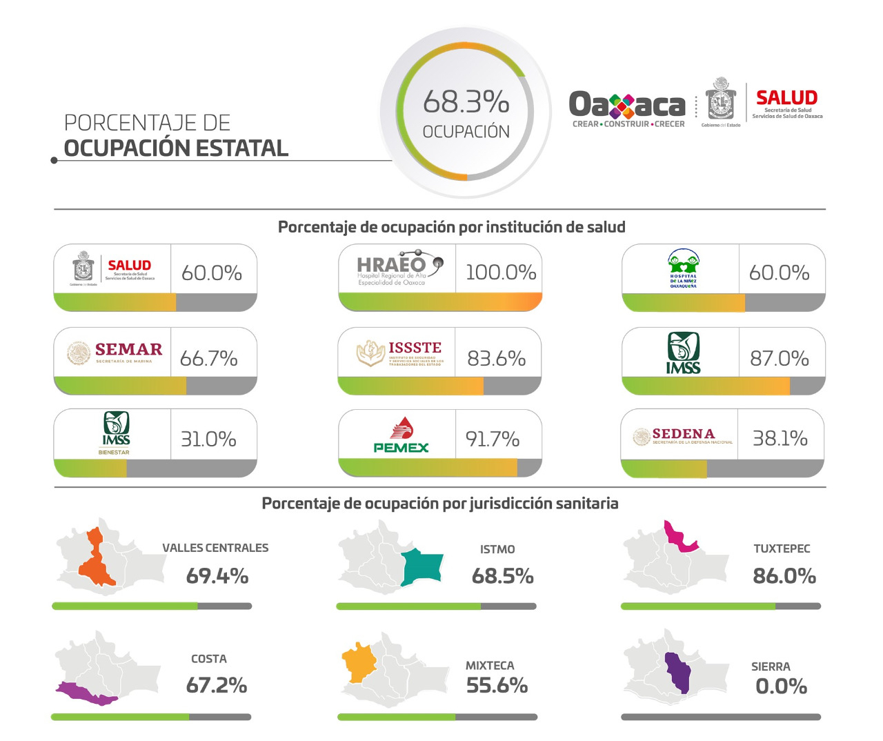 La institución destacó que hay 17 nosocomios que están al 100% de su capacidad, lo que ha ocasionado que la ocupación global de la red hospitalaria del Sector Salud sea del 68.3%, pues de las 495 camas destinadas para atender a pacientes con esta enfermedad, hay 338 ocupadas y 157 libres. Las Jurisdicciones Sanitarias de Tuxtepec y Valles Centrales, presentan un 86% y 69.4% de saturación respectivamente.