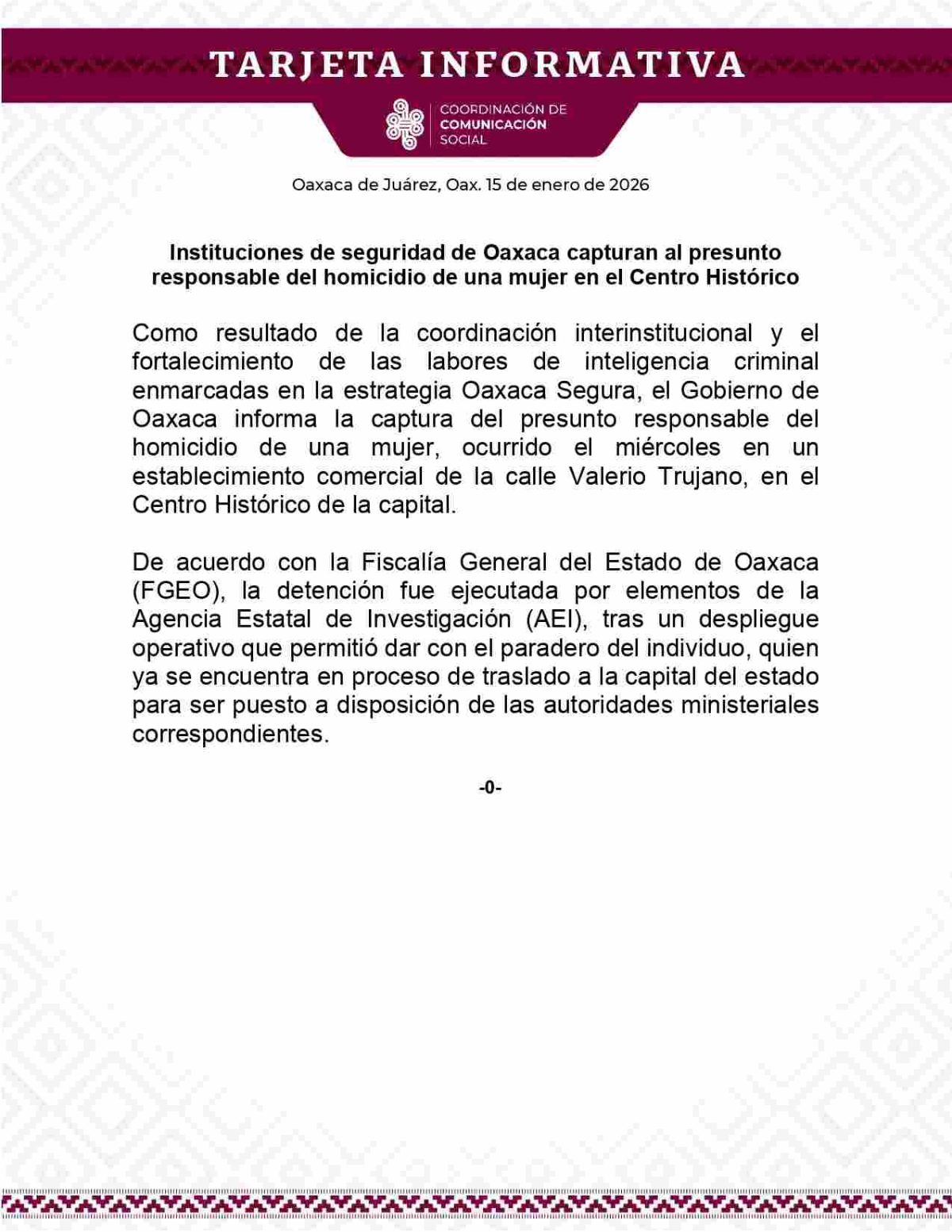 De acuerdo con información de la Fiscalía General del Estado de Oaxaca (FGEO), la detención fue realizada por elementos de la Agencia Estatal de Investigación (AEI), luego de un despliegue operativo que permitió ubicar y asegurar al sospechoso.