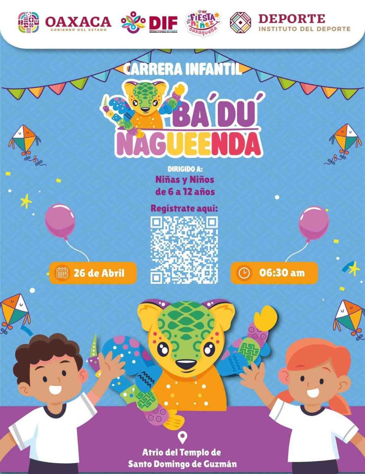 El Sistema para el Desarrollo Integral de la Familia Oaxaca, en coordinación con el Instituto del Deporte del Estado de Oaxaca, convocó a niñas y niños de entre 6 y 12 años a participar en la carrera atlética infantil “BA´DU´NAGUEENDA”, que se realizará el próximo 26 de abril a las 7:00 horas en el atrio del Templo de Santo Domingo de Guzmán.