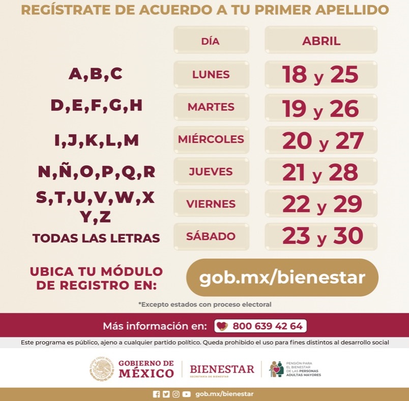El registro se hará de acuerdo con el primer apellido de la persona adulta mayor, exceptuando los estados que cursan proceso electoral.