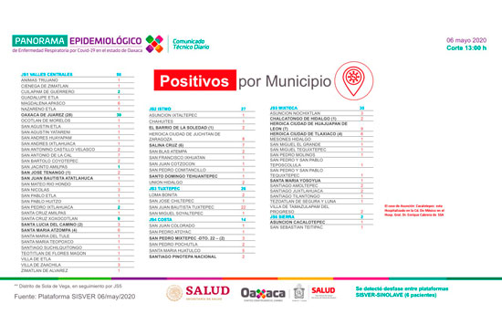 La subdirectora de Innovación y Calidad de los Servicios de Salud de Oaxaca (SSO), Rosa Lilia García Kavanagh, informó que de acuerdo al comunicado técnico diario de este miércoles 6 de mayo, se han contabilizado 202 casos positivos de COVID-19 en la entidad.