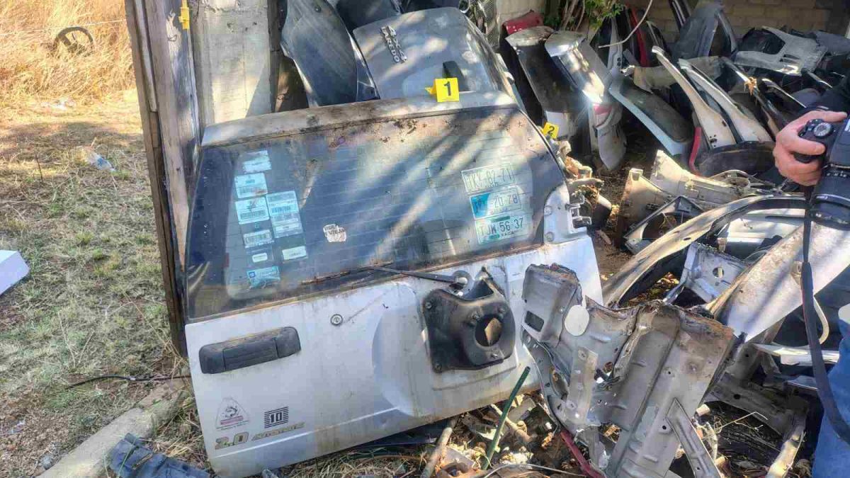 El segundo operativo tuvo lugar en el paraje El Chisme, donde se aseguraron motores, puertas de cajuela, una puerta lateral con acetato despintado, tableros y otras piezas automotrices.