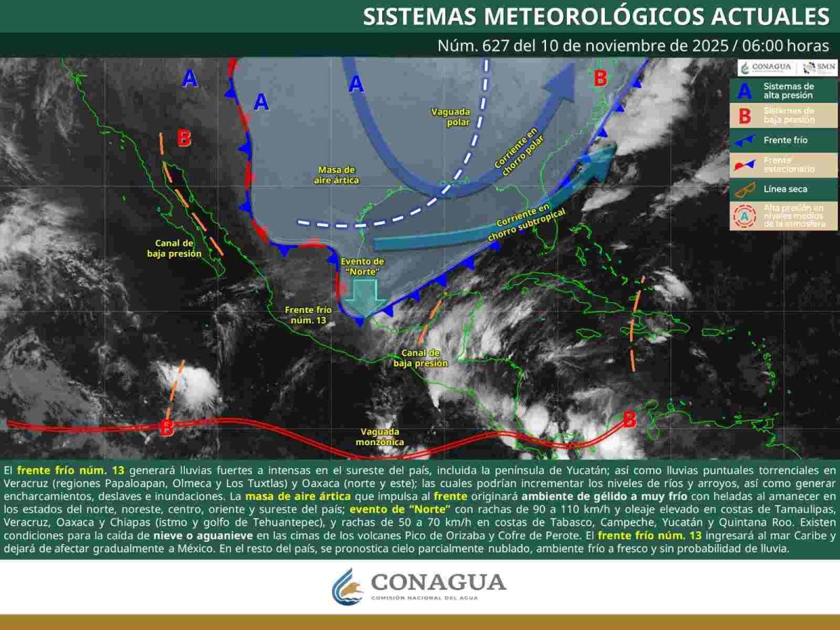 El fenómeno meteorológico estará acompañado de una masa de aire frío de origen ártico, que provocará un notable descenso en las temperaturas, principalmente en zonas por encima de los mil 800 metros de altura, como la Mixteca, las sierras de Juárez, Flores Magón y del Sur, donde podrían registrarse heladas en picos altos.