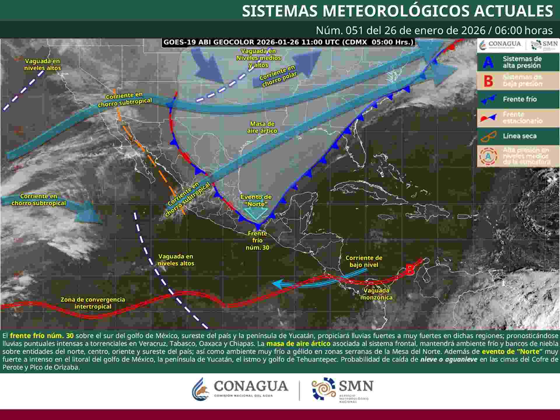 El Servicio Meteorológico Nacional (SMN) informó que el desplazamiento del frente frío número 25 sobre el litoral del Golfo de México, en combinación con un río atmosférico, una vaguada en altura sobre la península de Yucatán y el ingreso de humedad del océano Pacífico, provocará lluvias puntuales intensas en Tamaulipas, Veracruz, Puebla, Oaxaca, Chiapas y Tabasco.