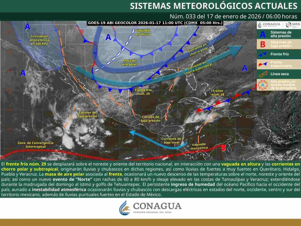 La presencia del frente frío 29 mantiene condiciones meteorológicas adversas en Oaxaca, con lluvias, bajas temperaturas, vientos intensos y alto riesgo de heladas en regiones montañosas del estado, informó la Coordinación Estatal de Protección Civil y Gestión de Riesgos (CEPCyGR).