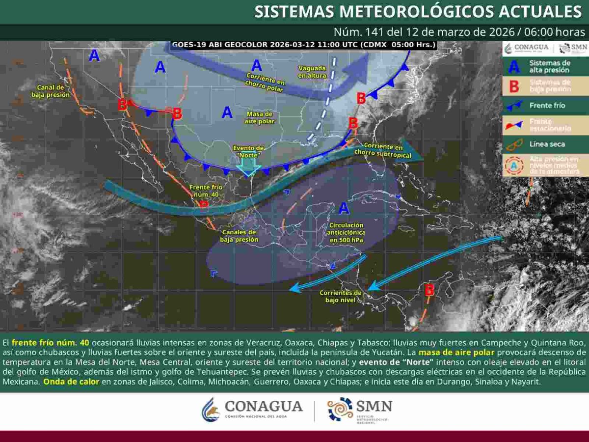 De acuerdo con el reporte del sistema meteorológico, este frente frío se extiende desde una zona de baja presión ubicada en la península de Florida hasta el sureste de México, impulsado por una masa de aire frío que avanza hacia el sureste del país.