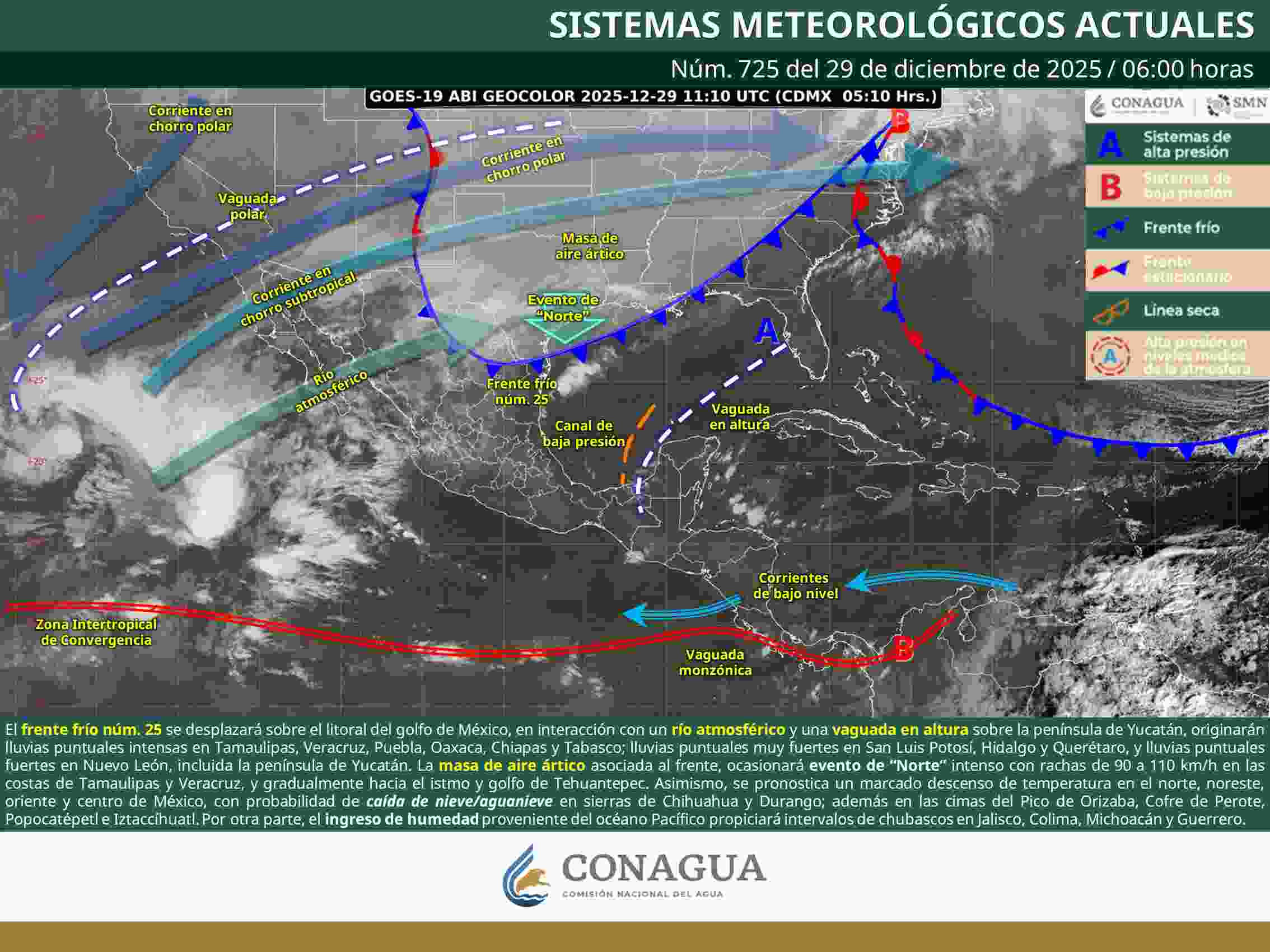 En lo referente a temperaturas, se esperan valores mínimos de 0 a 5 grados Celsius con posibles heladas en zonas montañosas de Baja California, Chihuahua, Durango y Sonora.