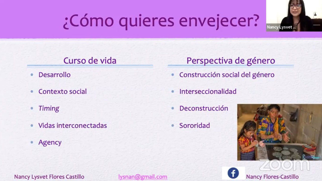 Por su parte, la ponente y especialista, Nancy Lizbeth Flores Castillo, convocó a envejecer de forma consciente desde dos perspectivas, la de género y la de curso de vida; asimismo describió el concepto de envejecer como un proceso gradual que conlleva cambios biológicos, acumulativo, de transformación constante y de construcción de aprendizajes. En tanto la vejez es una etapa de construcción social que en México empieza a los 60 años.
