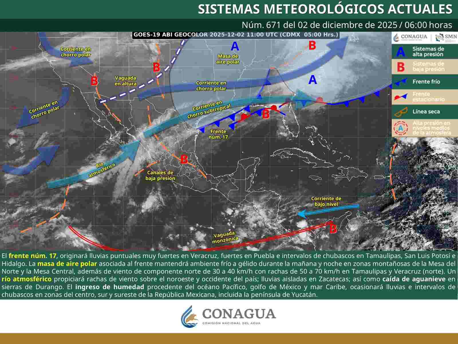 Lo anterior, será originado por el Frente Frío Número 40 que se localiza en el norte del país, en interacción con la corriente en chorro subtropical y un canal de baja presión a lo largo de la Sierra Madre Oriental, además del ingreso de humedad del Océano Pacífico y Mar Caribe.
