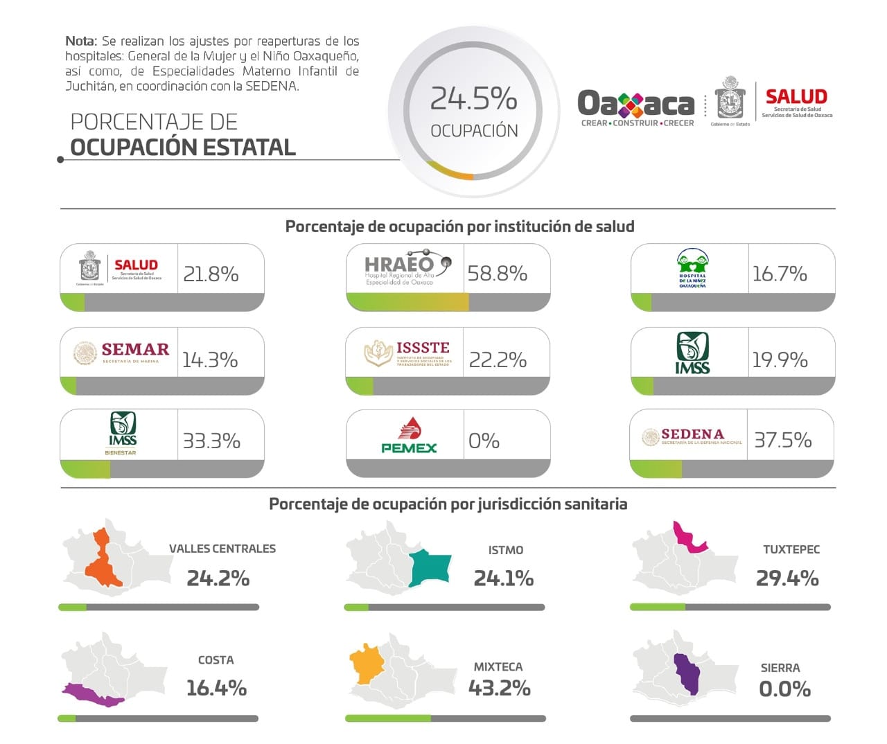 De la hospitalización, la dependencia mencionó que hay 106 pacientes internados, de ellos, dos son de nuevo ingreso, de ahí que se tienen disponibles 327 camas de un total de 433 para la atención de la población oaxaqueña. La red de nosocomios en la entidad reporta una ocupación del 24.5%, y cinco unidades médicas se encuentran al 100% de su capacidad.