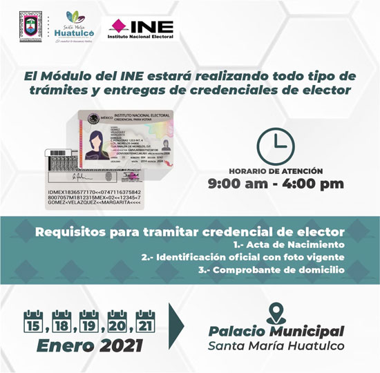 El gobierno municipal informa a la ciudadanía que el Módulo del INE estará realizando todo tipo de trámites y entregas de credenciales de elector durante los días 15, 18, 19, 20 y 21 de enero del 2021 en el palacio municipal de Santa María Huatulco.