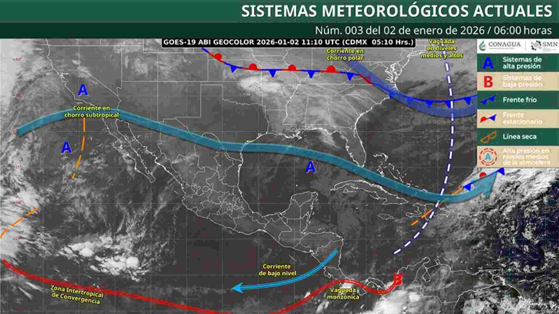 Además, el frente frío número 41 se desplazará a lo largo de la vertiente del Golfo de México en interacción con un canal de baja presión sobre el sureste