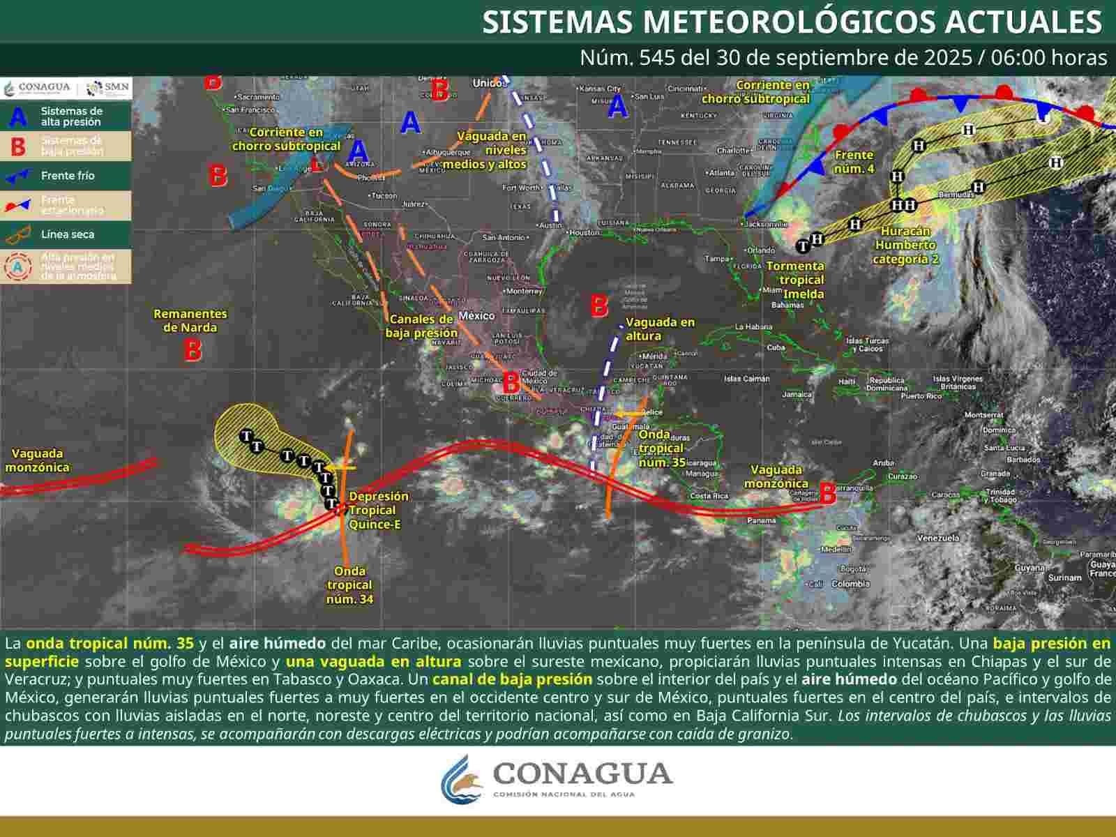 De acuerdo con el pronóstico de la Comisión Nacional del Agua (Conagua), estas precipitaciones están asociadas a la Onda Tropical número 35, que se desplaza sobre el sur del país y presenta probabilidad de desarrollo ciclónico frente a las costas de Oaxaca. Este sistema, además, está inmerso en la vaguada monzónica, lo que favorece la formación de nublados densos, tormentas eléctricas y chubascos.