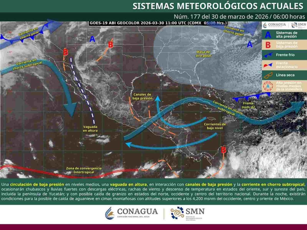 De acuerdo con el reporte, la masa de aire frío asociada al frente frío número 42 comenzará a modificar sus características, mientras que una vaguada en fortalecimiento propiciará lluvias con chubascos y tormentas aisladas durante la tarde en distintas regiones del estado.