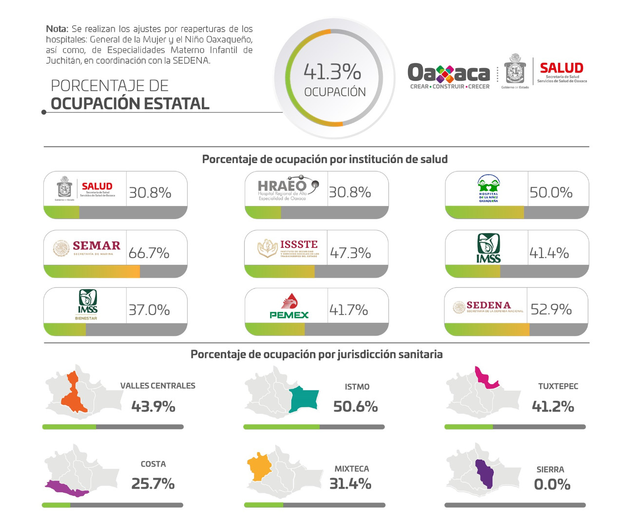 La institución indicó que la ocupación de la red médica global para la atención de la emergencia sanitaria se encuentra en 41.3%, mientras que hay cinco hospitales trabajando al 100%, sin embargo, el Sector Salud dispone de 263 camas de un total de 448 para pacientes que presenten complicaciones a causa del virus en las seis Jurisdicciones Sanitarias.