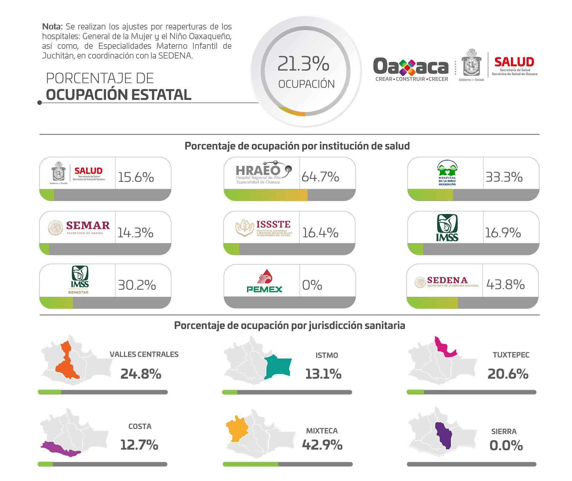 Por Jurisdicción Sanitaria, Valles Centrales presenta 24.8% de ocupación hospitalaria, Istmo 13.1%, Tuxtepec 20.6%, Costa 12.7%, Mixteca 42.9%, y Sierra no presenta pacientes hospitalizados.