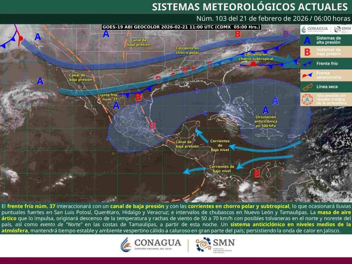 Por otra parte, el frente frío número 37 se mantiene sobre el noreste del país y podría aproximarse al sureste de México durante el fin de semana. La Comisión Nacional del Agua (Conagua) mantiene su monitoreo ante posibles cambios en las condiciones meteorológicas.
