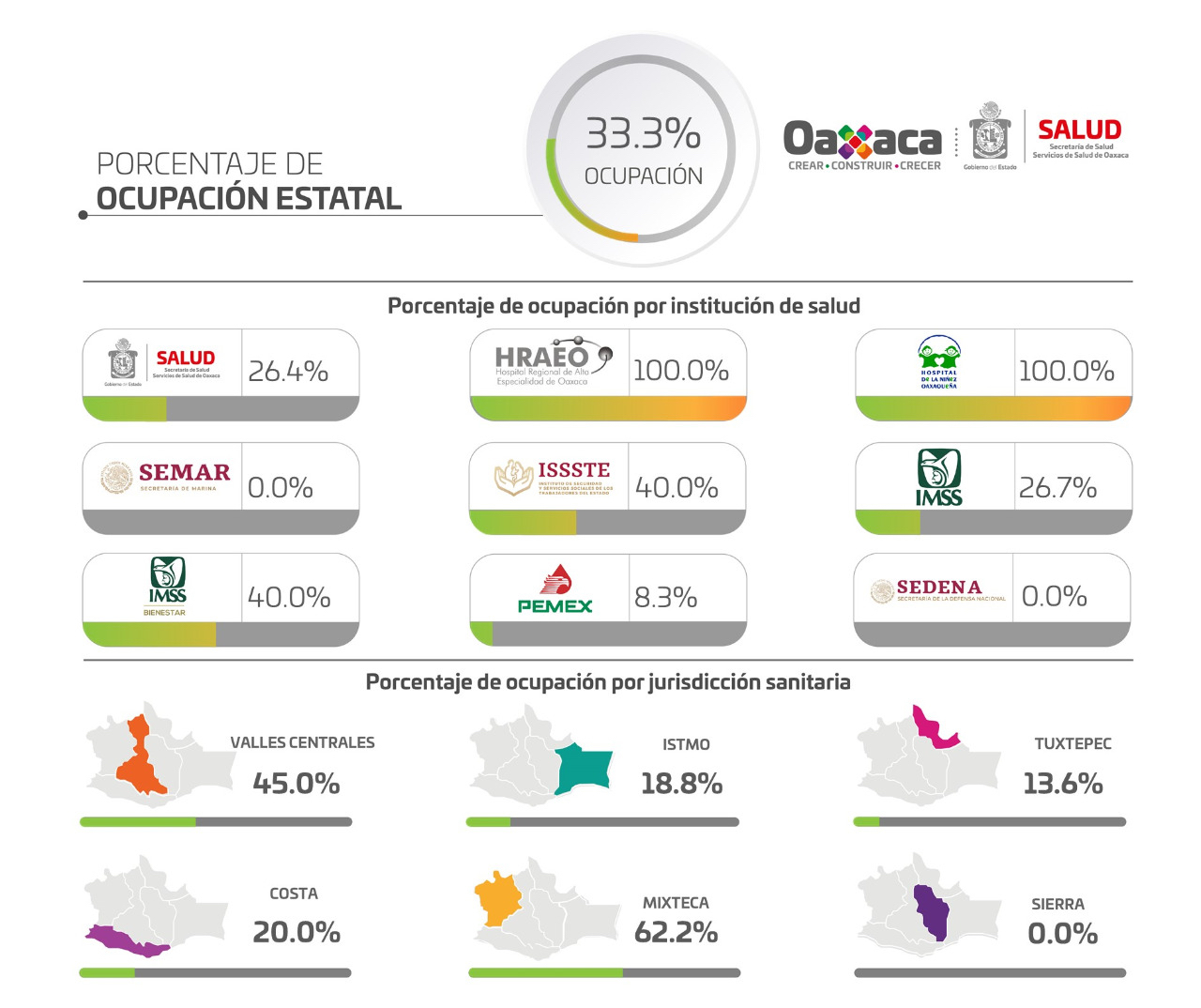 Se ha registrado 12 pacientes nuevos hospitalizados de los 141 que actualmente se encuentran recibiendo atención médica por el SARS-CoV-2, hay 282 camas disponibles de un total de 423. La Jurisdicción Sanitaria de la Mixteca registra un 62.2% de camas ocupadas, seguido de Valles Centrales con 45% y Costa 20%.