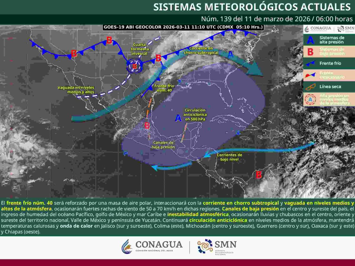 Estas condiciones se relacionan con la presencia del frente frío número 40, reforzado por una masa de aire polar que se desplaza por el norte del país. Aunque sus efectos directos se concentran en otras regiones, el sistema meteorológico interactúa con canales de baja presión y humedad proveniente del Pacífico, generando lluvias y nubosidad en el sureste del país.