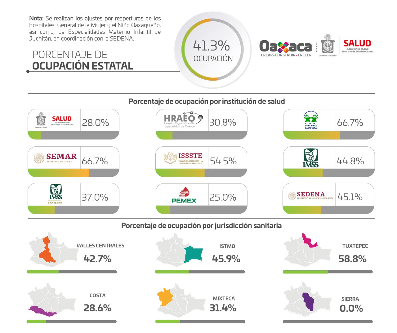Al corte de este martes, los Servicios de Salud de Oaxaca (SSO), registran una ocupación hospitalaria global del 41.3 por ciento, así como cinco hospitales al 100 por ciento de ocupación y tres nuevos hospitalizados por COVID-19.