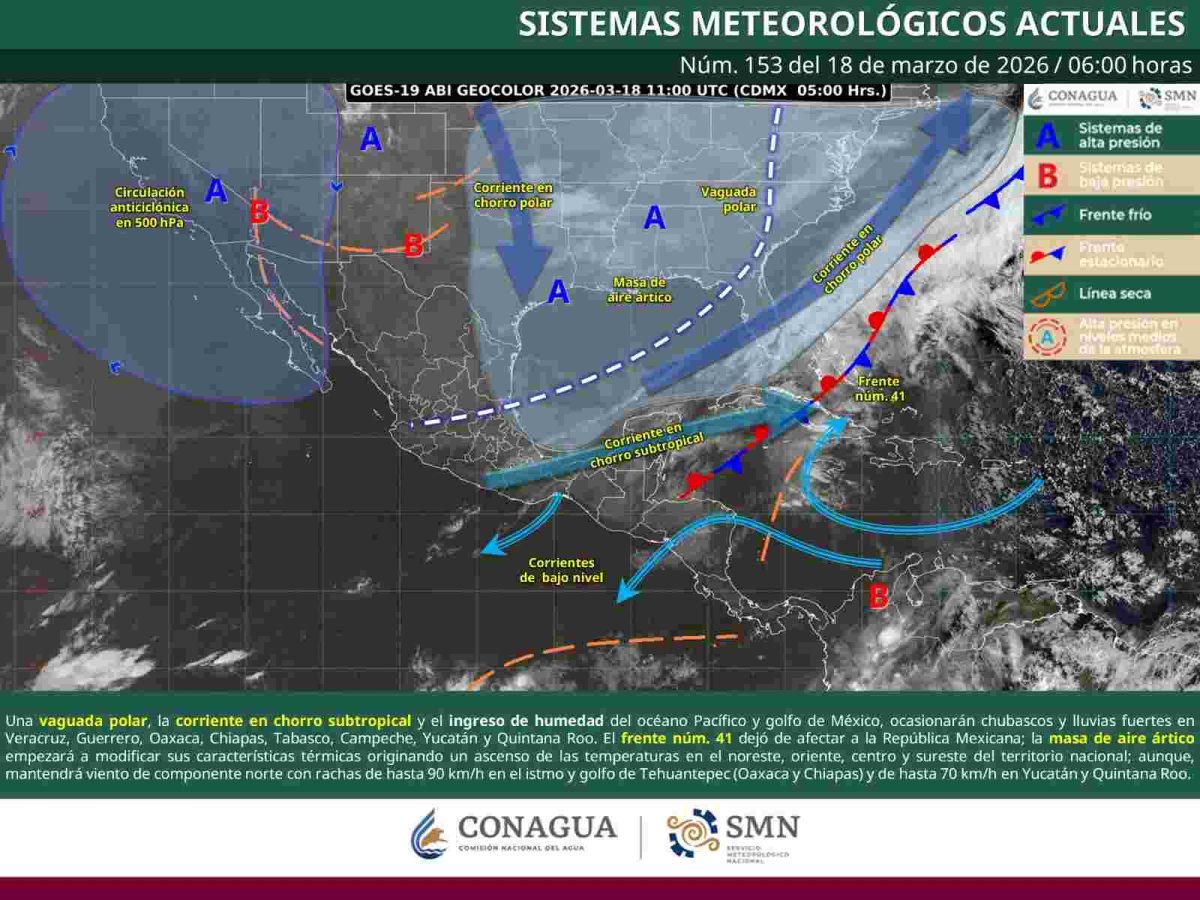 En tanto, el frente frío número 41 se desplazará hacia Cuba, aunque mantendrá un movimiento lento, lo que seguirá influyendo en las condiciones del clima en Oaxaca.