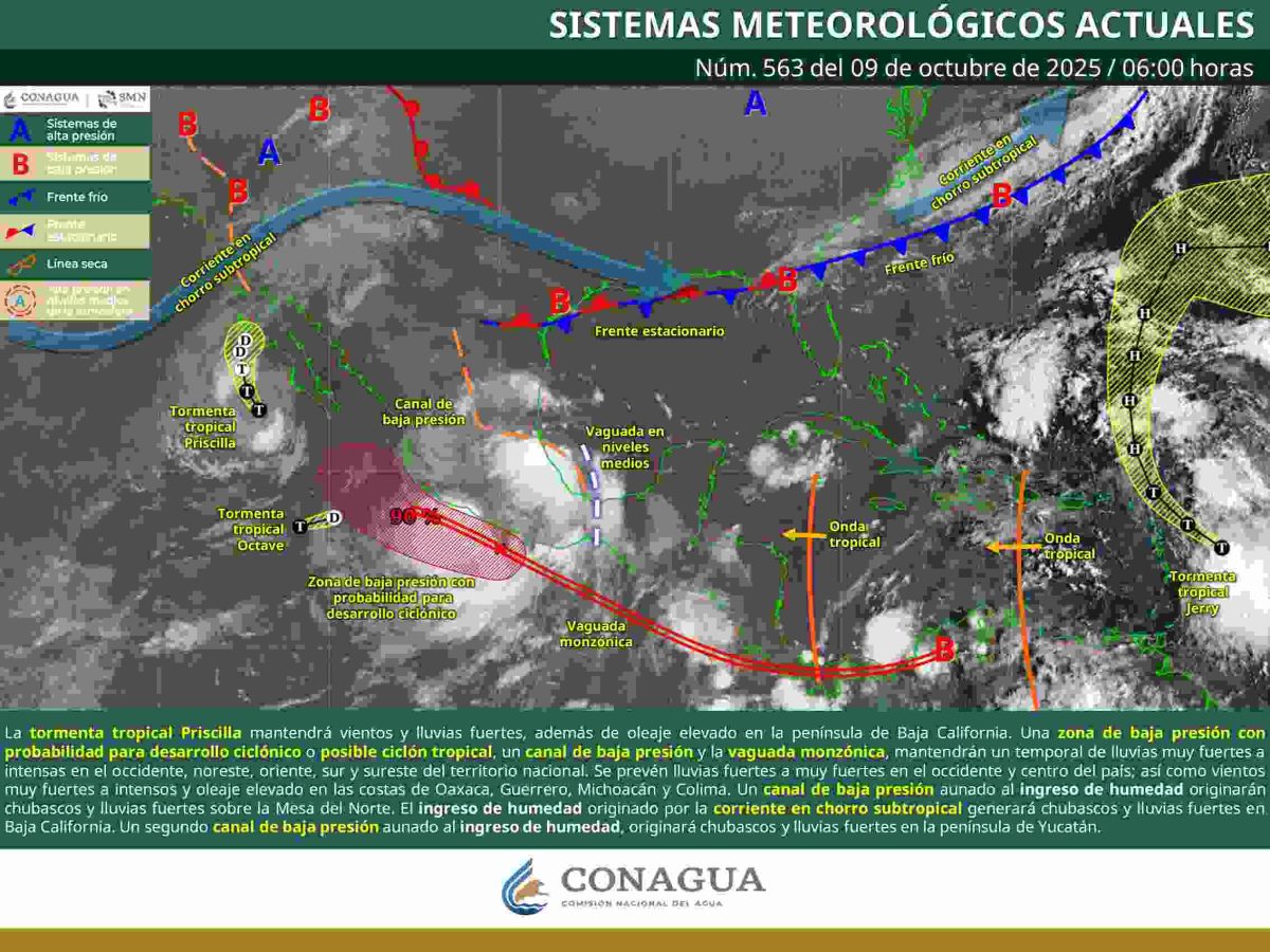Se prevén turbonadas mar adentro y oleaje elevado a lo largo de la línea costera, especialmente en las regiones del Istmo de Tehuantepec y la Costa. Las autoridades recomiendan extremar precauciones en actividades marítimas y seguir las indicaciones de Capitanías de Puerto.