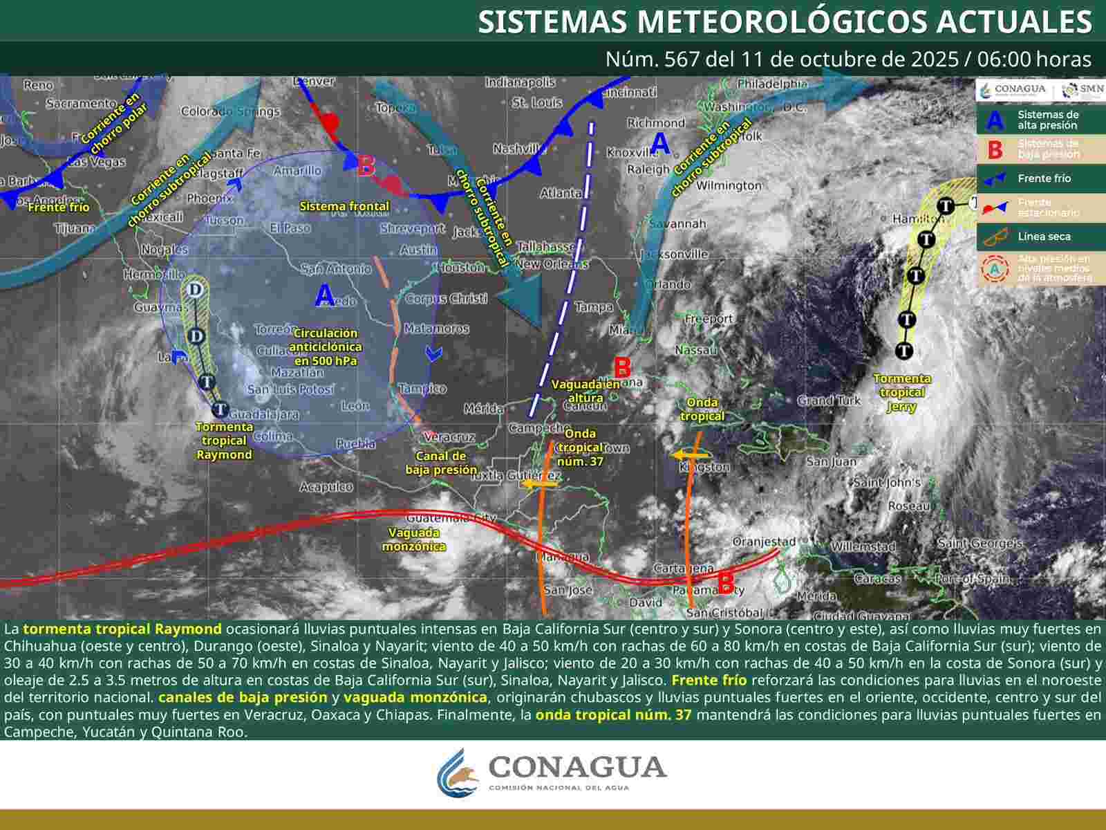 Se prevén turbonadas mar adentro y oleaje elevado a lo largo de la línea costera, especialmente en las regiones del Istmo de Tehuantepec y la Costa. Las autoridades recomiendan extremar precauciones en actividades marítimas y seguir las indicaciones de Capitanías de Puerto.