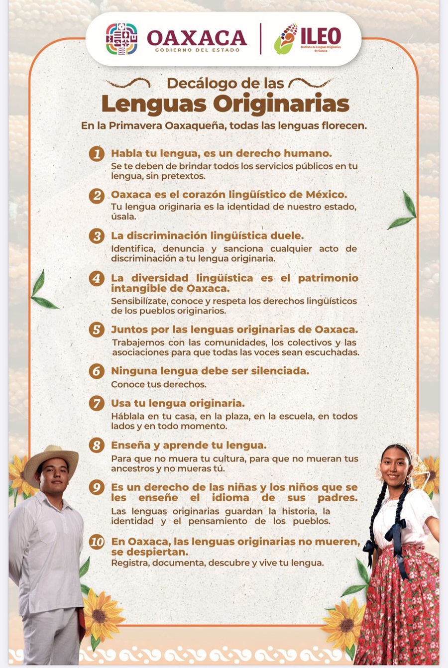 En un acto simbólico para la preservación de las lenguas originarias, el director del Instituto de Lenguas Originarias de Oaxaca (ILEO), Víctor Cata, presentó el Decálogo de las Lenguas Originarias “En la Primavera Oaxaqueña, todas las lenguas florecen”. Esta iniciativa tiene como objetivo garantizar los derechos de las personas hablantes de las lenguas indígenas, tanto en su tradición oral como escrita.
