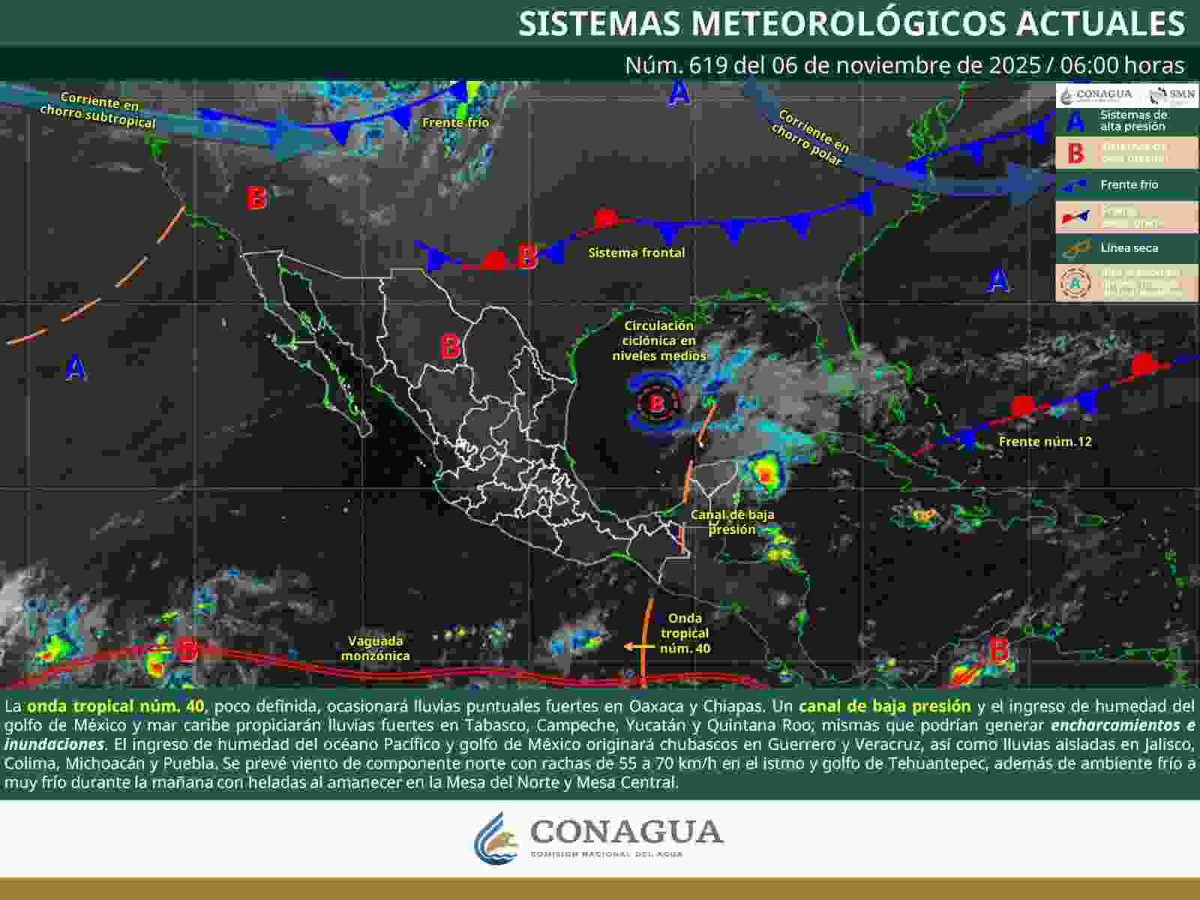 De acuerdo con el pronóstico de la Comisión Nacional del Agua (Conagua), las condiciones meteorológicas están relacionadas con la onda tropical número 40, que avanza lentamente sobre el sur de México y se combina con un canal de baja presión, provocando inestabilidad atmosférica.