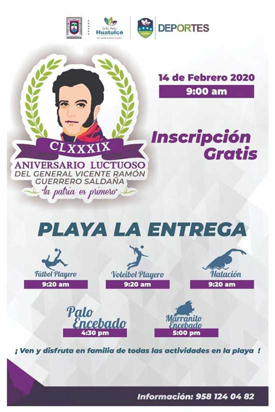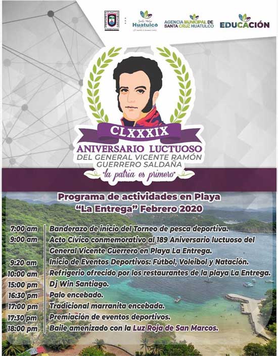 El Gobierno Municipal de Santa María Huatulco y el comité organizador de la Playa La Entrega, invita a la ciudadanía a participar en las actividades en conmemoración del 189 Aniversario luctuoso del General Vicente Guerrero.