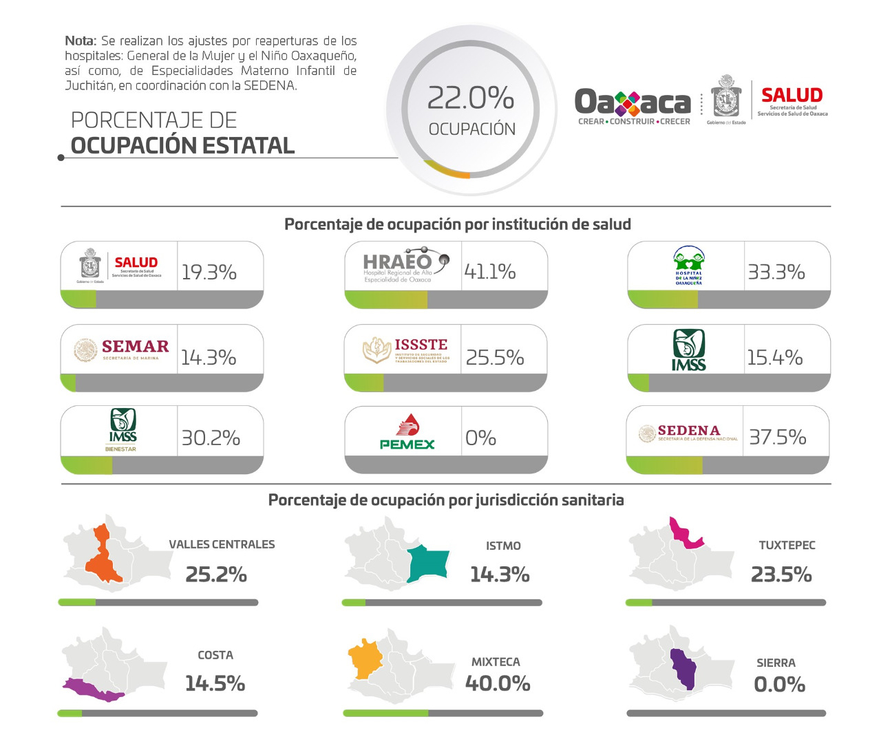 Al corte de este lunes, los Servicios de Salud de Oaxaca (SSO), tienen registrados ocho casos nuevos de COVID-19 y cero defunciones, hay 178 casos activos en 58 municipios, y tres hospitales se encuentran al 100% de su capacidad.
