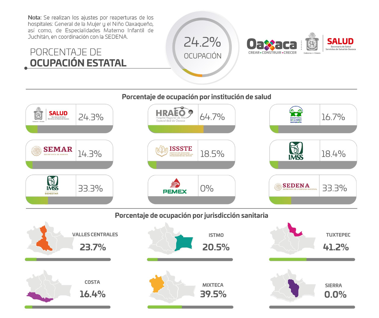La red médica global se encuentra en 24.2% con 4 nosocomios que se encuentran al 100% de saturación y seis pacientes que ingresaron a hospitalización en las últimas 24 horas por complicaciones derivadas de este padecimiento. la Jurisdicción Sanitaria de Tuxtepec registra un 41.2% de camas ocupadas por pacientes COVID-19, seguido de la Mixteca con 39.5%, Valles Centrales 23.7%, Istmo 20.7%, Costa 16.4% y Sierra 0%.