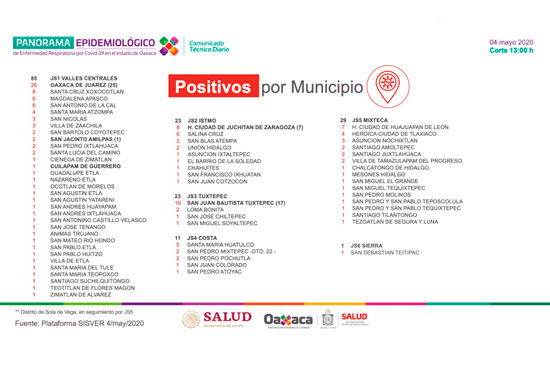 El director de Atención Médica de los Servicios de Salud de Oaxaca (SSO), Erick Azamar Cruz informó que de acuerdo al comunicado técnico diario de este lunes 4 de mayo, se registró una defunción más – un hombre de 82 años, residente de la región Mixteca- por lo que suman 24 decesos por COVID-19 en la entidad.