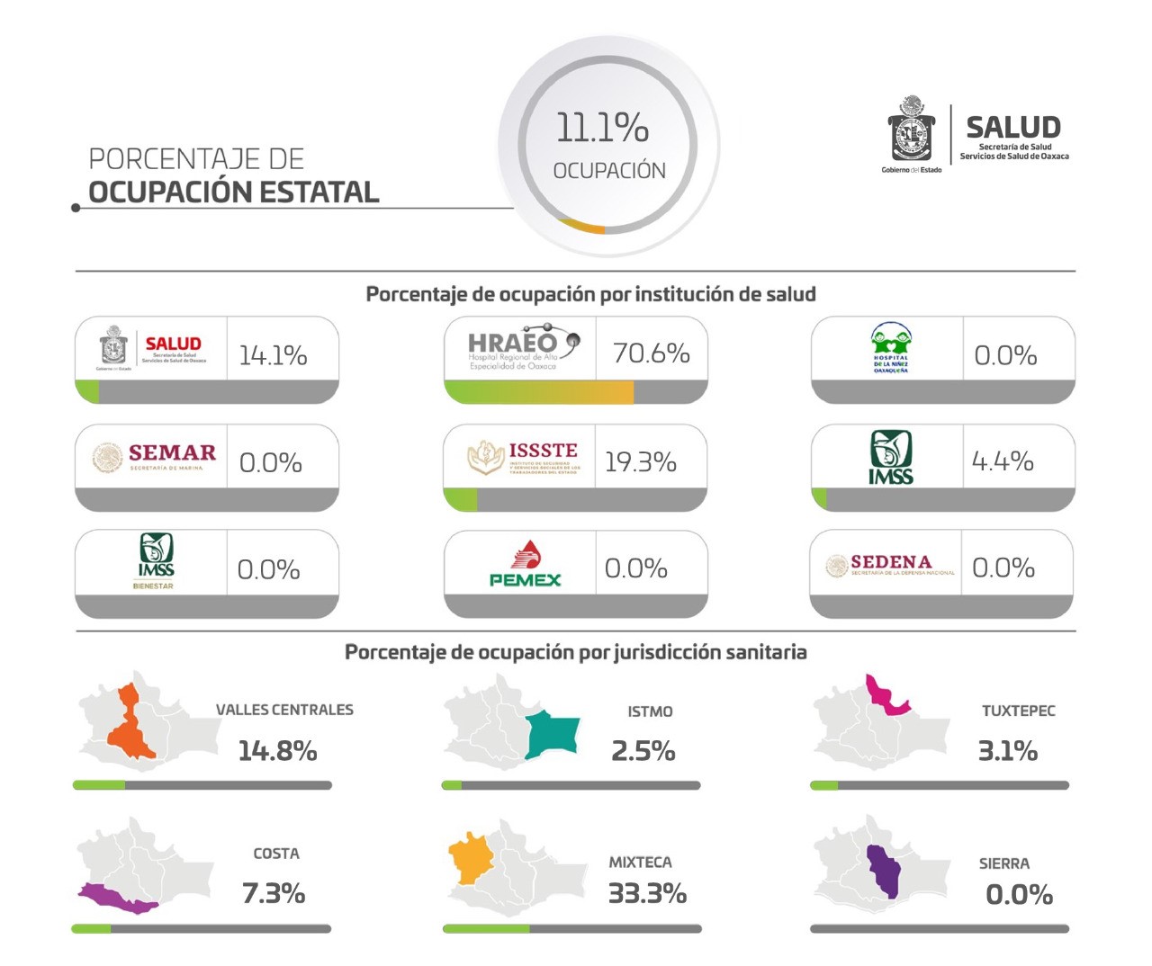 Valles Centrales tiene un acumulado de 72 mil 839 contagios, dos mil 674 muertes y 128 casos activos, seguido por el Istmo con 16 mil 631 casos, mil 348 muertes y 97 activos; Tuxtepec con ocho mil 871 casos, 616 muertes y 29 activos; Costa con ocho mil 262 casos, 510 muertes y 22 activos; Mixteca con ocho mil 767 casos, 640 muertes y 13 activos; Sierra con tres mil 836 casos, 344 muertes y cuatro activos.
