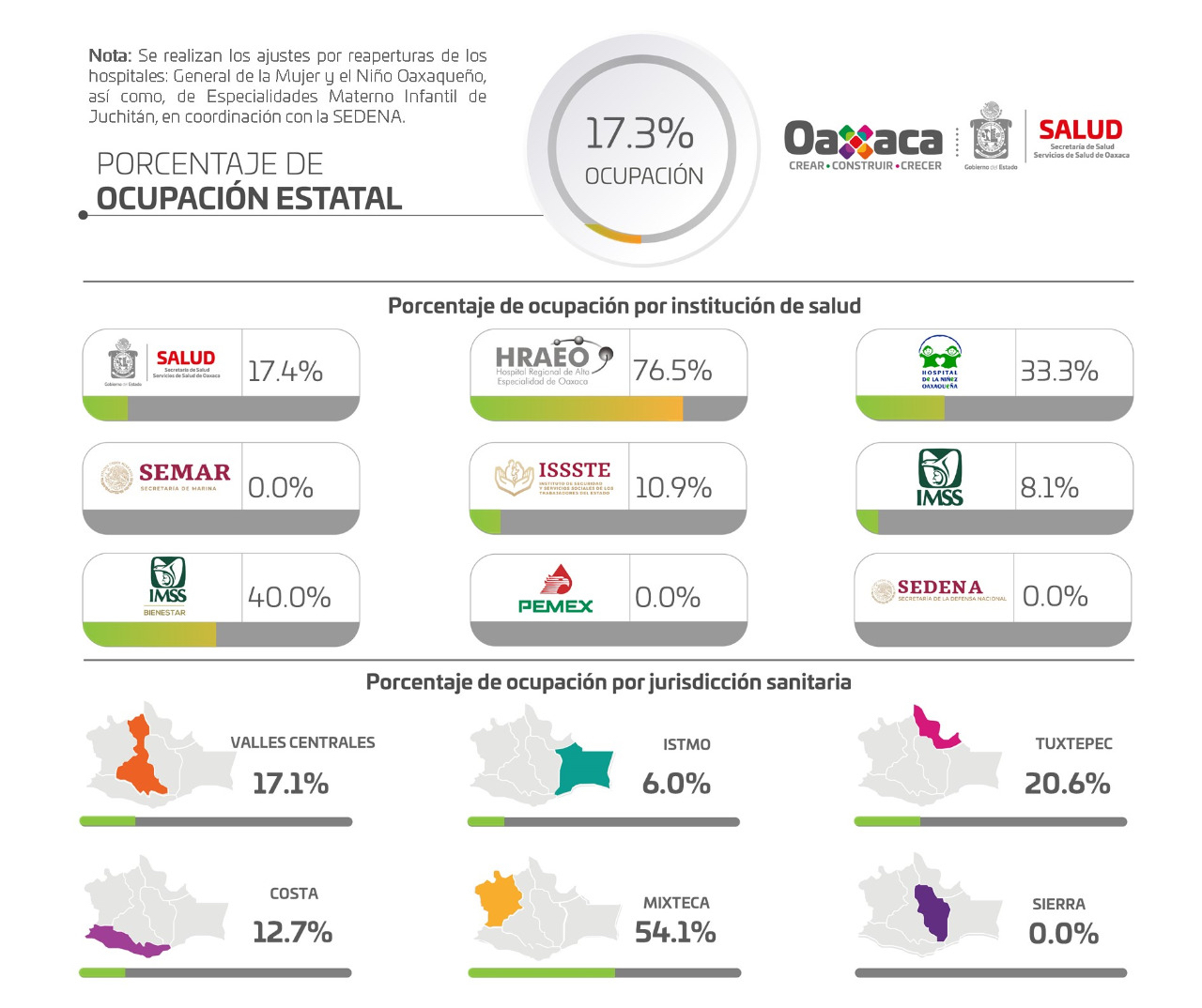 Hay 73 camas ocupadas de un total de 349 disponibles de un total de 422 para la atención de la pandemia, la Jurisdicción Sanitaria de la Mixteca registra un 54.1% de saturación, Tuxtepec 20.6%, Valles Centrales 17.1%, Costa 12.7%, Istmo 6.0%, y Sierra 0%.