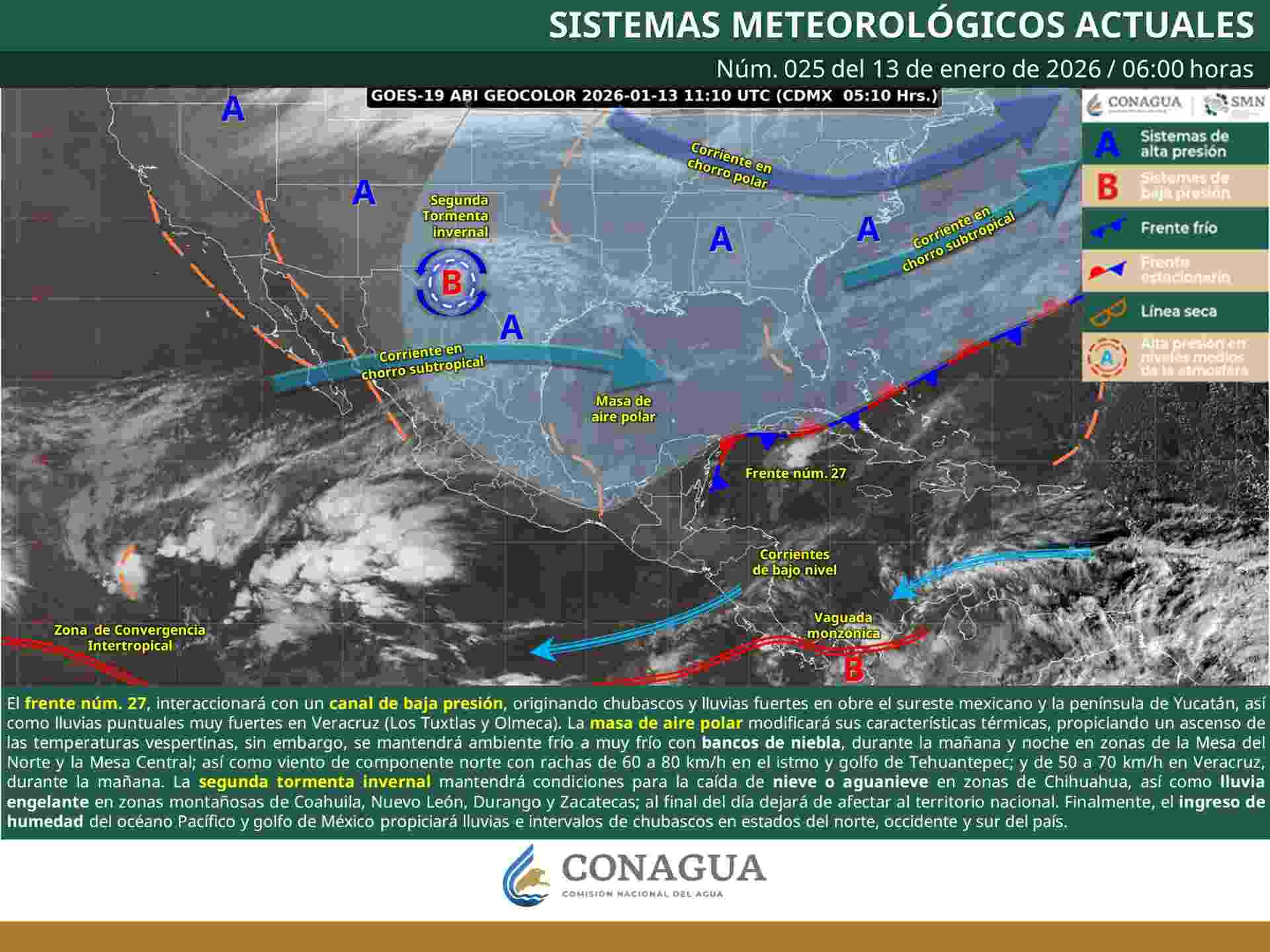 Hoy, una línea seca que se extenderá sobre el norte de la República Mexicana, en interacción con inestabilidad en niveles altos de la atmósfera y la corriente en chorro subtropical, ocasionarán lluvias puntuales intensas (de 75 a 150 milímetros [mm]), descargas eléctricas, caída de granizo y rachas fuertes de viento de hasta 90 kilómetros por hora (km/h), así como la posible formación de torbellinos o tornados en regiones del noreste de Chihuahua, Coahuila, Nuevo León y Tamaulipas.