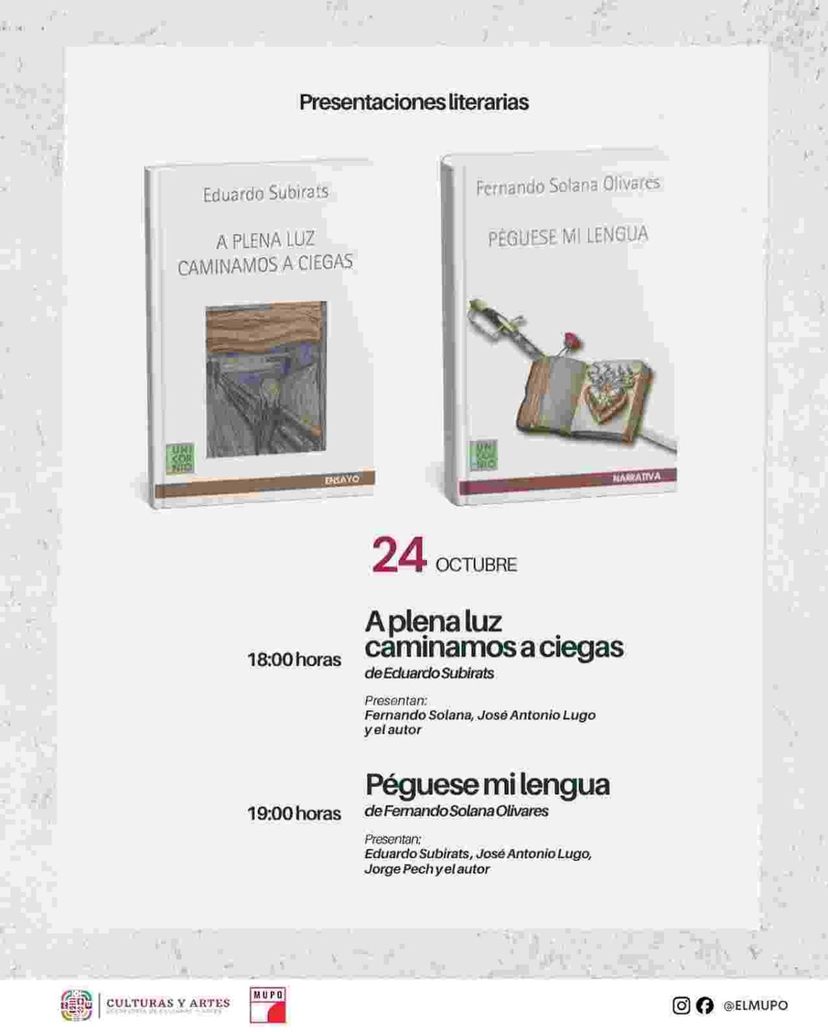La actividad iniciará a las 18:00 horas con la presentación del libro de ensayos “A plena luz caminamos a ciegas”, de Subirats, quien celebra 50 años de trayectoria literaria. Posteriormente, a las 19:00 horas, se presentará la novela histórica “Péguese mi lengua”, de Solana Olivares, que recrea el amor trágico entre Miguel Miramón, presidente más joven de México, y su esposa Concepción Lombardo, fieles al emperador Maximiliano hasta su fusilamiento en el Cerro de las Campanas.