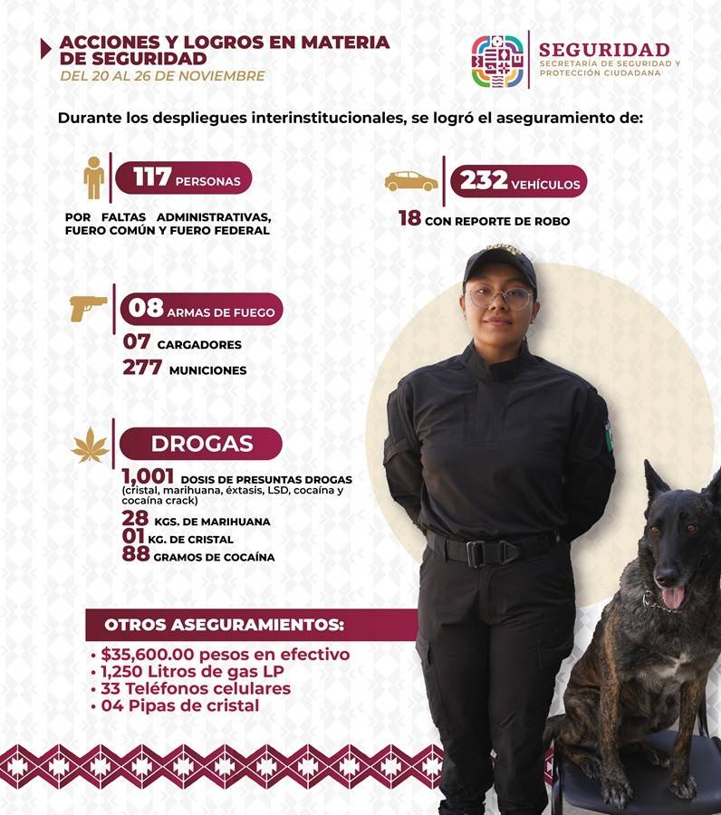 El Gobierno de Oaxaca a través de la Secretaría de Seguridad y Protección Ciudadana (SSPC), realizó más de mil 500 aseguramientos de presuntas drogas, vehículos, armas de fuego y otros, del 20 al 26 de noviembre, como parte de las acciones permanentes para garantizar la paz y tranquilidad en la entidad.