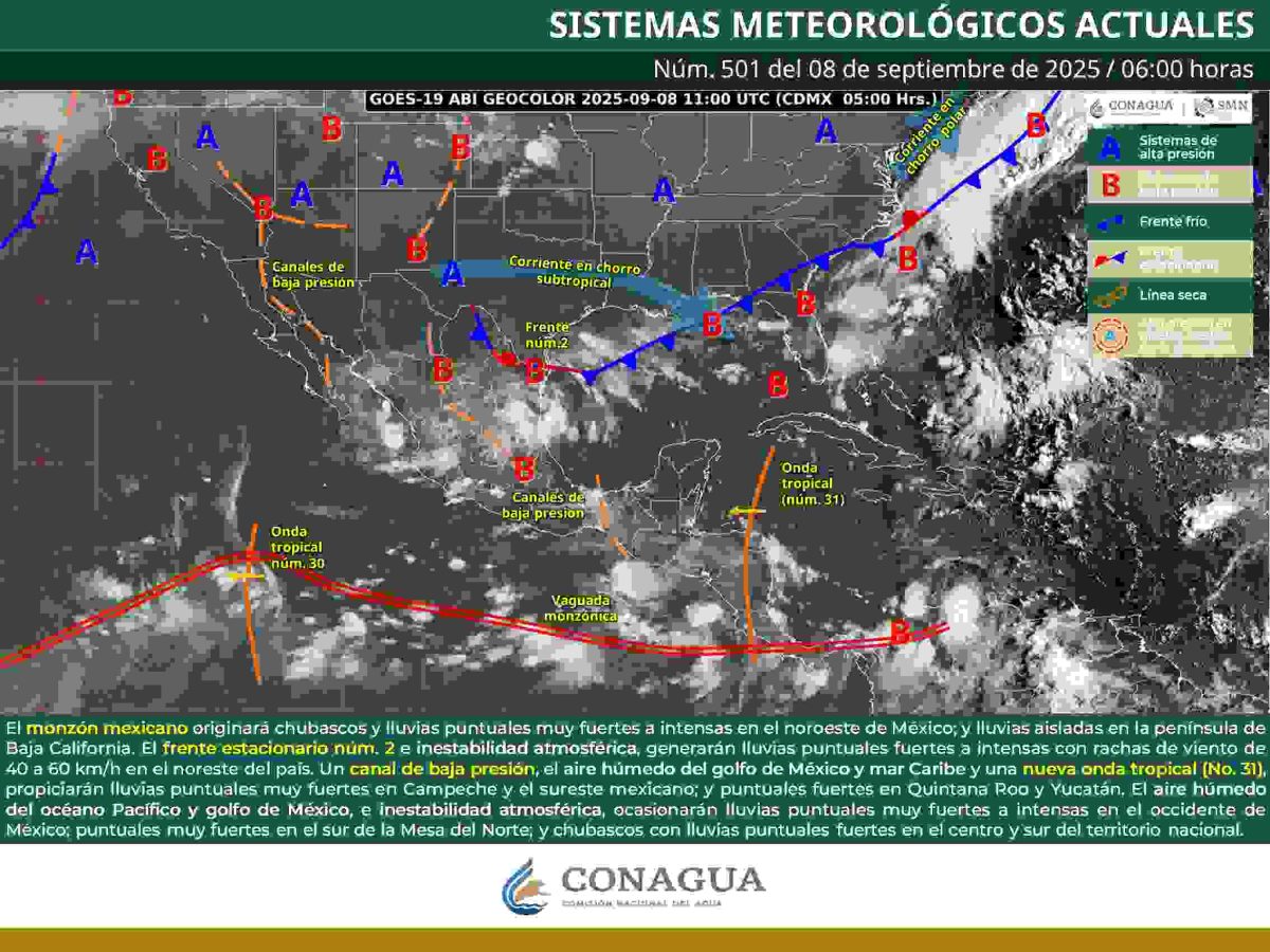 >> Según el pronóstico de la Conagua), un canal de baja presión sobre el sureste de México, combinado con la entrada de humedad del Océano Pacífico y Golfo de México, generará abundante nubosidad y lluvias.