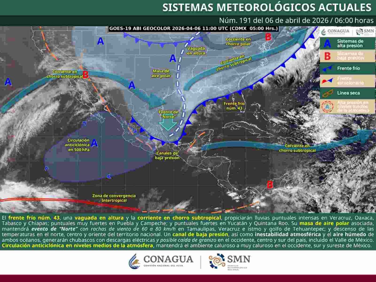 Oaxaca de Juárez, Oax., 6 de abril de 2026.- El frente frío número 43 continuará generando tormentas, posible caída de granizo y rachas intensas de viento en distintas regiones de Oaxaca, con mayor incidencia en la mitad norte del estado durante la tarde y noche, informó la Coordinación Estatal de Protección Civil y Gestión de Riesgos.